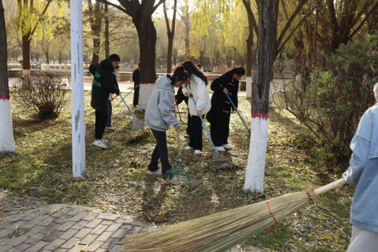 告别教室的理论课堂,同学们拿着扫帚、耙子来到校园主干道、绿化带旁。金黄的落叶铺满地,恰似青春奋斗的底色。大家分工协作、干劲十足:有的弯腰清扫,有的集中装运,有的细致捡拾角落残叶,原本散乱的落叶被整齐堆放,校园环境焕然一新。